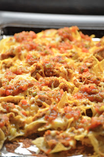 Last week when Josh and I were watching the NCAA Final Four Championship game, which was an incredible game, I decided to make nachos. My favorite way to cook nachos is by spreading tortilla chips on a baking sheet, topping it with refried beans, taco meat (I had some leftover from making tacos the night before), shredded Mexican cheese blend, jarred sliced jalapenos, chili powder, and pepper.